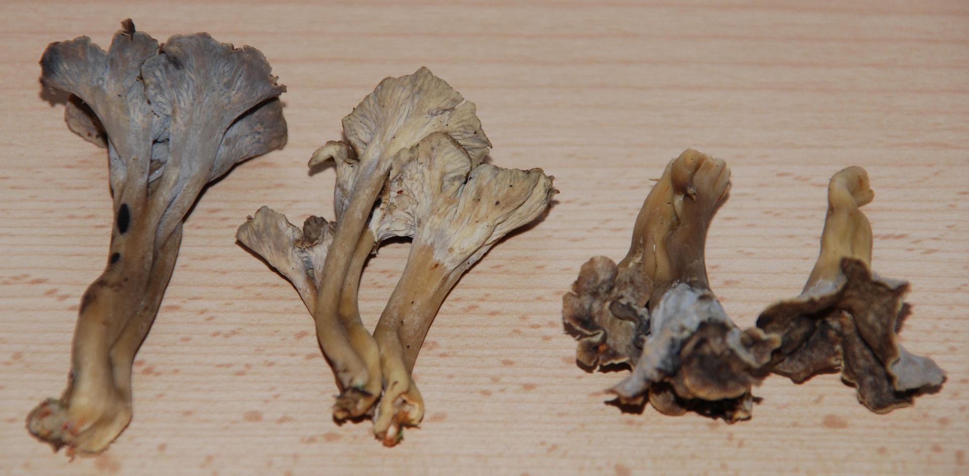 Nach der Studie unserer Pilzbücher waren wir eigentlich sicher, dass es sich um den Trompetenpfifferling handelt. Um sicher zu gehen haben wir dann noch im Internet nachgeforscht und waren dann auf einmal gar nicht mehr sicher, da wir so viele verschiedene Bilder gesehen haben.