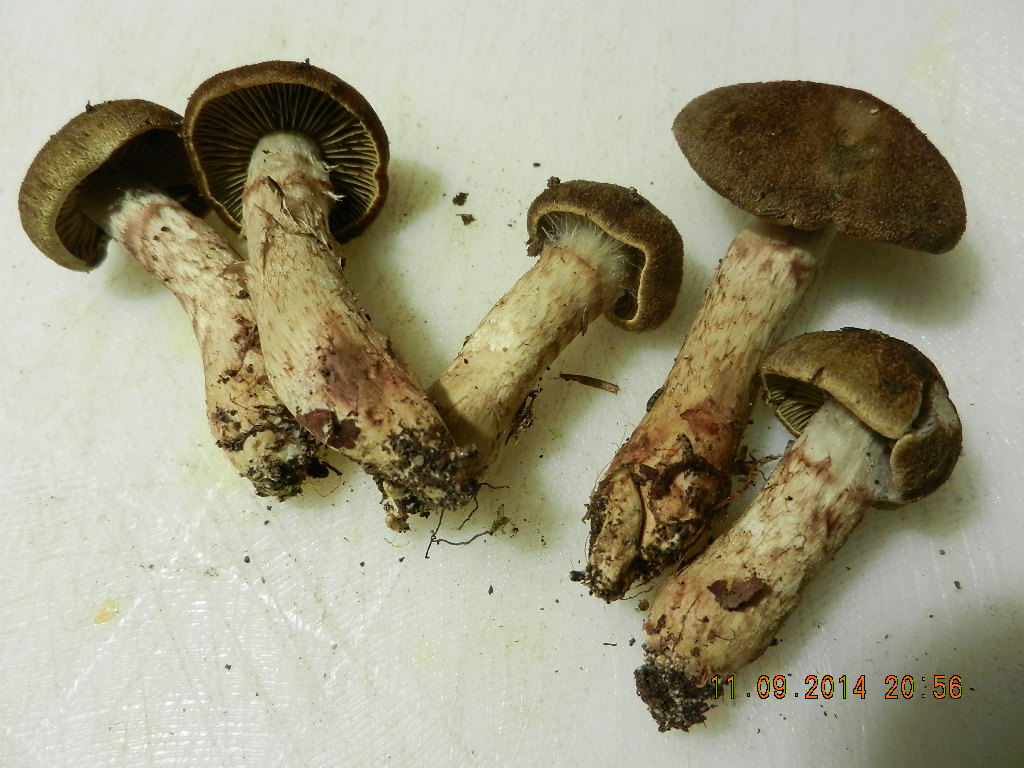 Pilz 3: Braunnetziger Raukopf (Cortinarius melanotus); ein ähnliches Geruchsspielchen: zunächst war nach dem Durchschneiden nur ein banaler Rettichgeruch wahrnehmbar, aber nach 3 Minuten an der frischen Luft roch das Teil dann tatsächlich vorschriftsmäßig petersilienartig! Da hätte man mich fast schon festhalten müssen, damit ich nicht sinnlos durchs Zimmer gehüpft wäre.