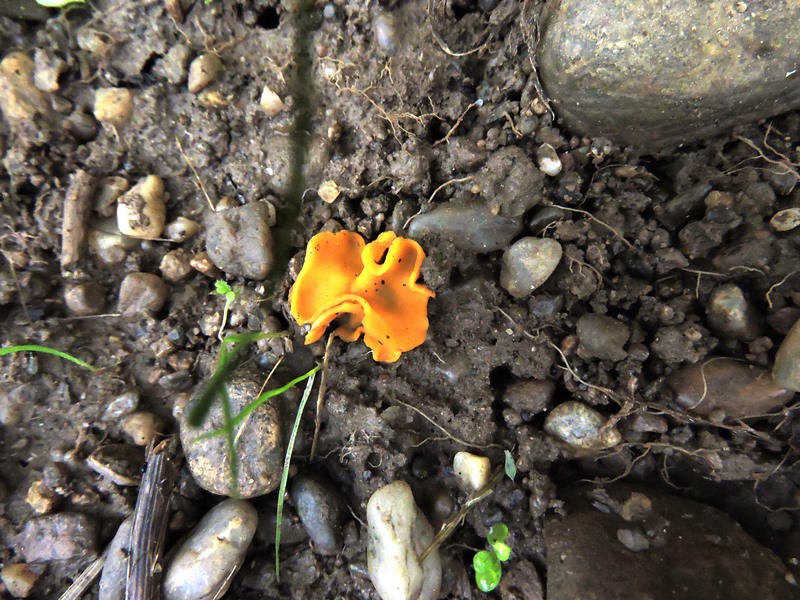 Oder ein Photo der Sporen, wenn du die untersucht hast.Das Habitat, die Färbung und der Habitus der Fruchtkörper passen hier aber schon zum Orangebecherling (Aleuria aurantia).