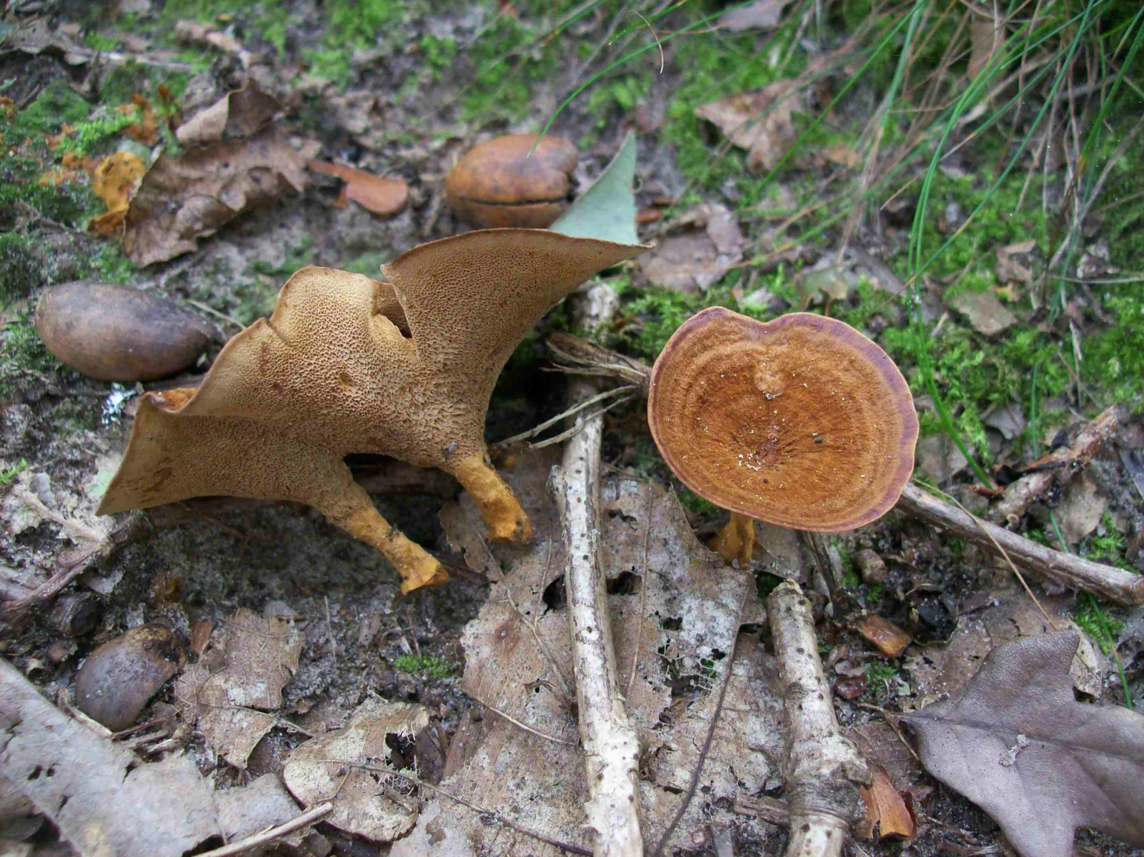 Gebänderter Dauerporling, Coltricia perennis. Der gestielte, konzentrisch gezonte, auf dem Boden wachsende Porling ist wohl ziemlich unverwechselbar. Eine ähnliche Art (C. cinnamomea) kommt in Deutschland wohl höchstens im Harz vor.