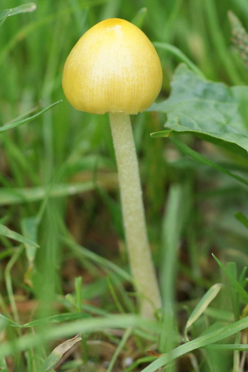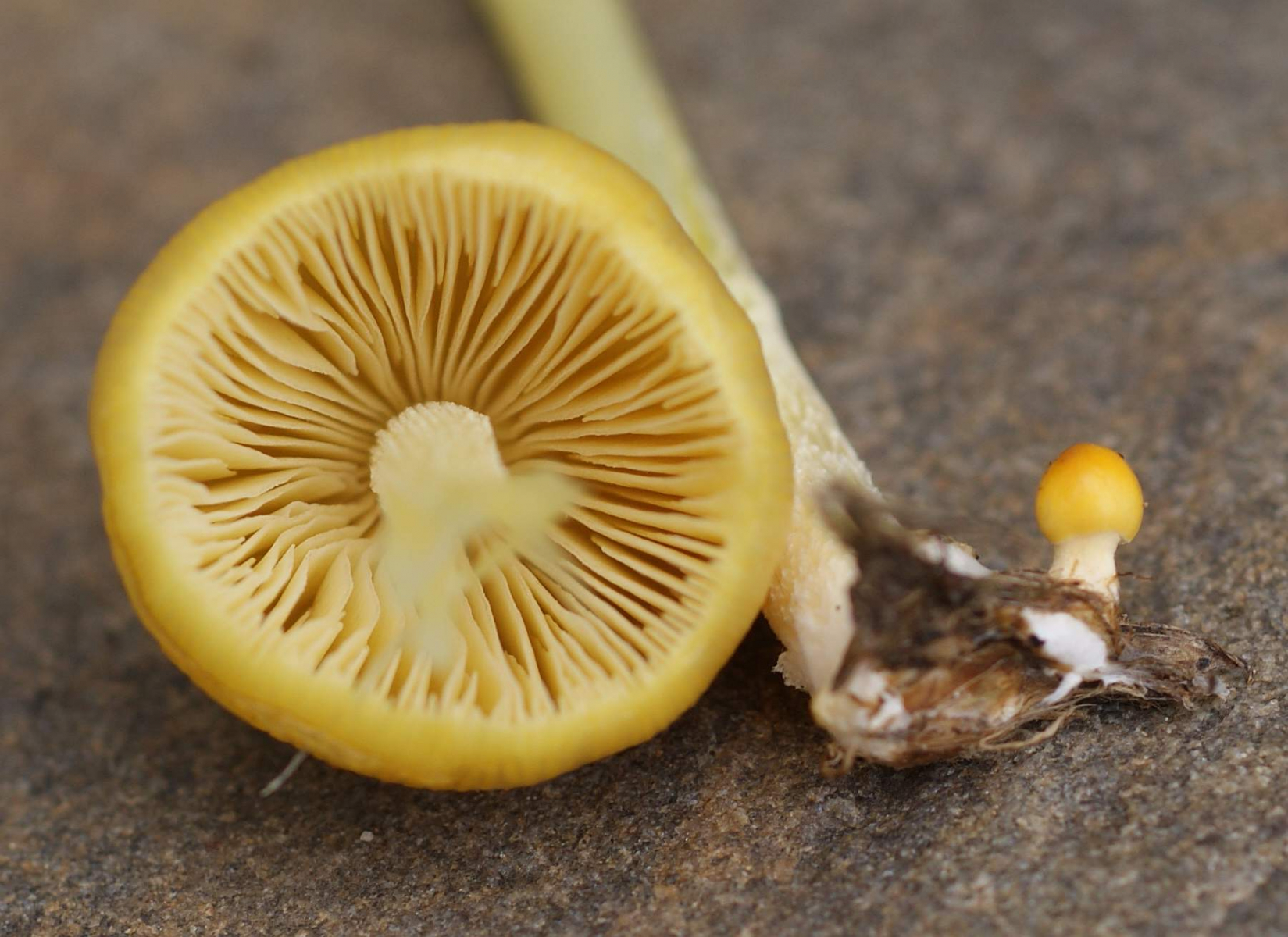 Hut: ca. 1,5 cm hoch, Hutrand wie gerieft bzw. Lamellen durchscheinend. Huthaut sehr leicht abziehbar, sie rollte sich bei Berührung schon von selbst vom Rand weg. Huthaut wie schmierig, jedoch nicht feucht. Hut und Lamellen lebhaft gelb. An der Hutspitze war die Farbe intensiver. Hutform: zum Hutrand wieder glockenähnlich zum Stil hin schmaler.