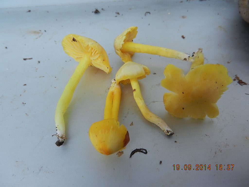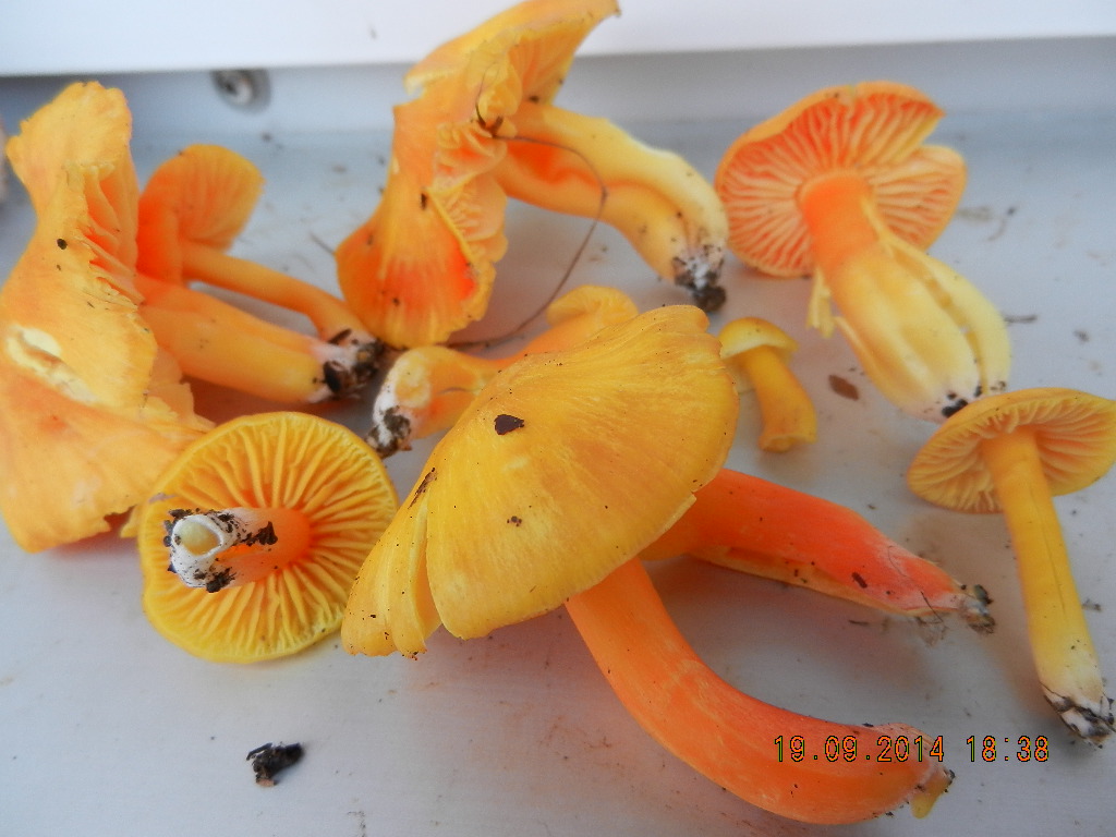 Bild 3: und der große quietschbuntere Bruder gleich neben dran: Eingeschnürtsporiger Saftling (Hygrocybe quieta). Kiss-Test auch beidesmal negativ