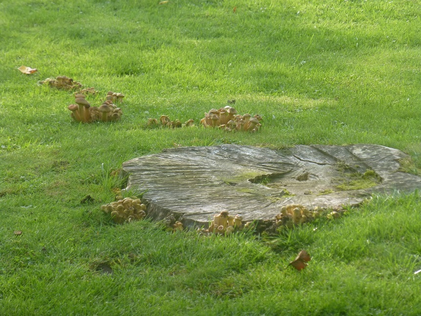 Der Pilz fruktizierte zahlreich am alten Birnenbaum im Garten, man erkennt sogar am Wuchs der Pilze noch den Wurzelverlauf teilweise, an dem ich vor fast vierzig Jahren als Kind noch schaukelte. Leider musste er vor drei Jahren gefällt werden, da er instabil wurde. Der Hallimasch könnte ein Grund dafür gewesen sein...
