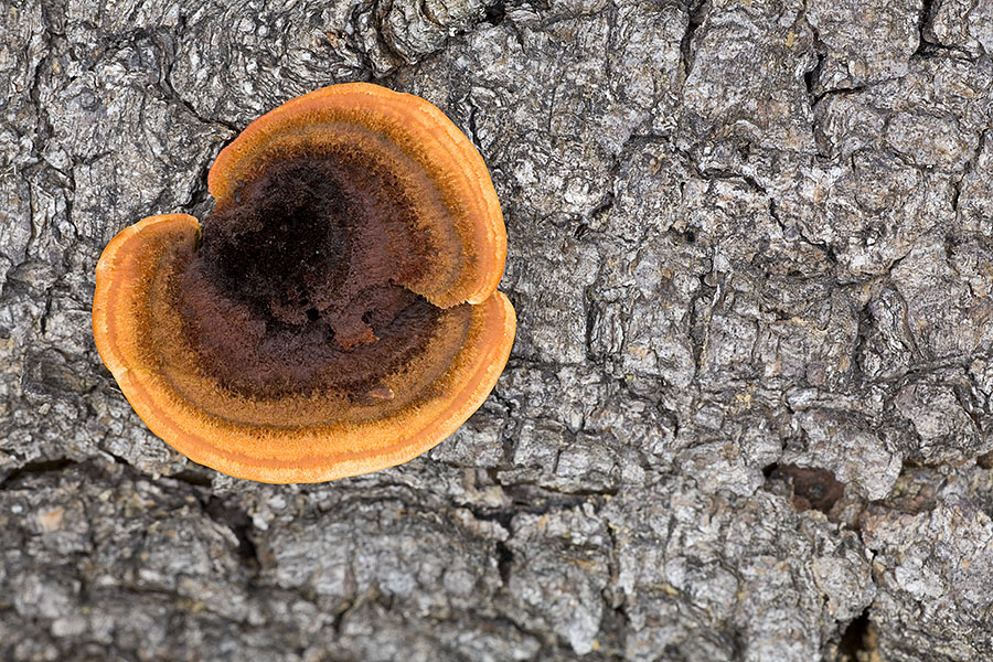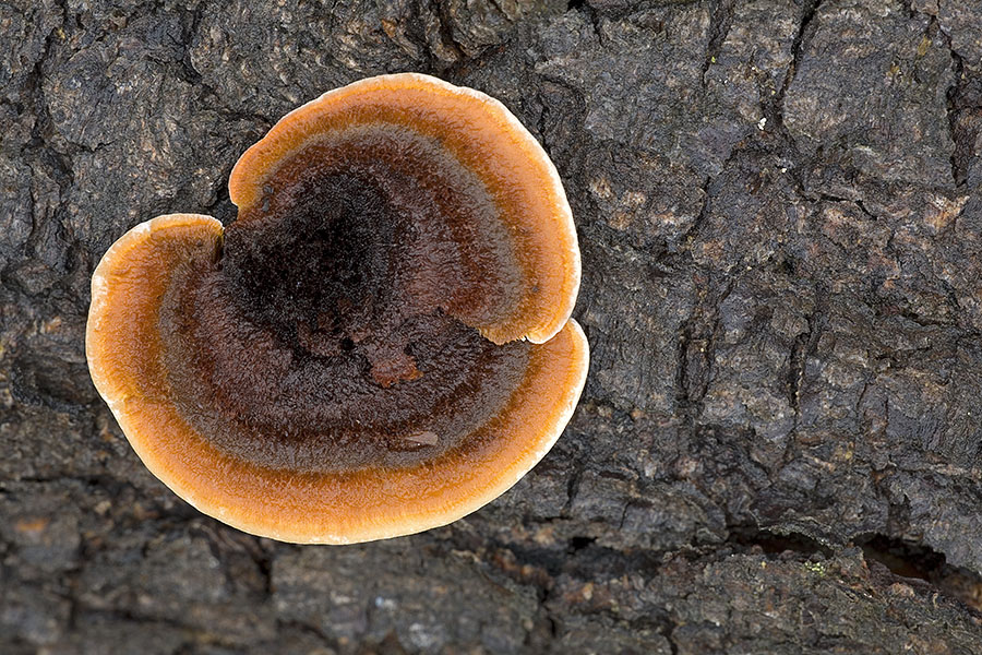 diesen Pilz habe ich Anfang August am Stamm eines abgesägten Kiefernstammes in einem Heidegebiet fotografiert. Neben diesem Exemplar wuchsen noch weitere an dem Stamm. Alle separart in einem Abstand von 10 -15 cm und teilweise auch in anderen Formen. Das erste Foto zeigt den Pilz im trockenen Zustand, das zweite ist im feuchten Zustand fotografiert worden.