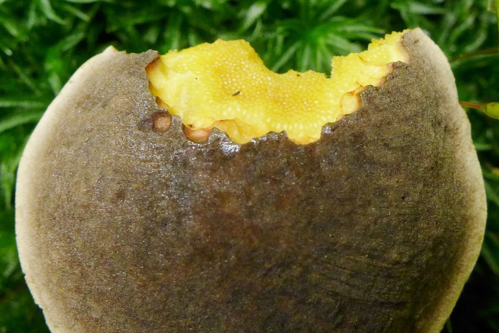 Auf nackter Erde völlig ungestielt, extrem zerbrechlich, außen kleiig und heller, teilweise waren da auch etwas gelblichere Exemplare.