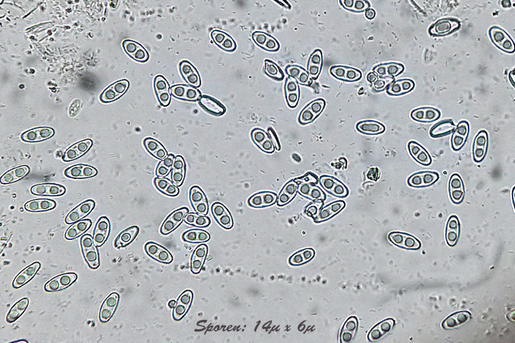 Die Sporen messen recht einheitlich 14 µ x 6 µ, Paraphysen spazierstockmäßig mit Tröpfchen.