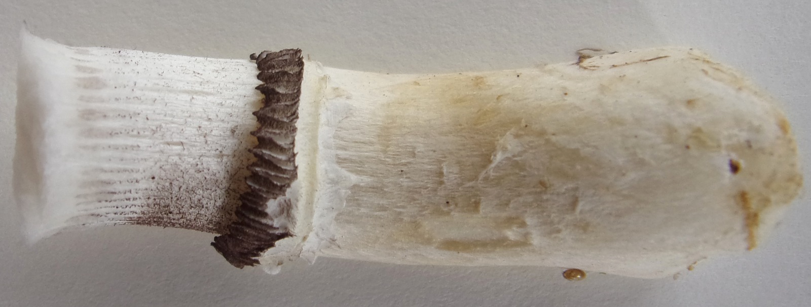 Stil: fest, innen weißfleischig, mit nicht verschiebbarem gezahnten Ring in Lamellenfarbe, Flocken oder Sporen oberhalb des Rings, Stielbasis leicht verdickt aber keine Knolle.