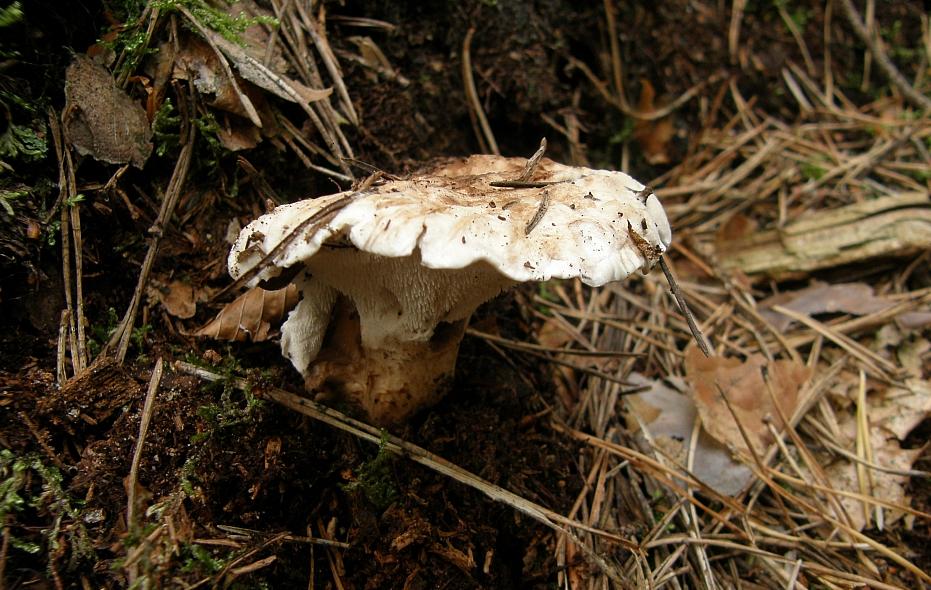 Ziemlich unglaublich: Ein leicht erkennbarer Stachling. Deutlich gestielt, in Hut und Stiel gegliedert, Fruchtkörper einzeln wachsend, weißes Sporenpulver und beim Antrocknen nach Maggi riechend. In der Gattung gibt es nicht viele Arten, diese hier wächst im Kiefernwald auf eher tockenen, gerne sandigen Böden, hat einen ungeschuppten, aber irgendwie wattigen Hut, in den gerne Partikel wie Kiefernnadeln, Zweiglein und sonstige Waldbestandteile einwachsen.
