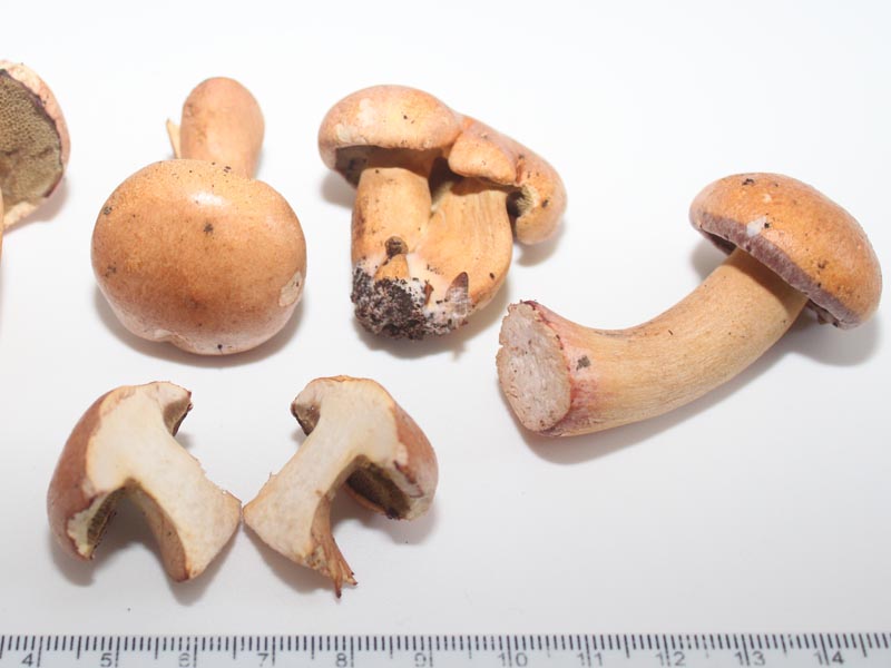 Bei den jungen Exemplaren ist der Hut stark gewölbt und etwa 4 cm im Durchmesser. Er ist ockerfarben oder hellbraun, wie man es definiert, und recht schmierig. Die Poren sind weiß mit braunen Verfärbungen und sehr fein, schätze 3 Poren pro mm. Am Übergang Hut / Stiel ist die Unterseite –žeingedellt–œ, s. Schnitt. Der Stiel verjüngt sich zum Hut hin. Er ist an der dicksten Stelle 2 cm im Durchmesser und schwarz geschuppt (beim rechten der beiden deutlich stärker als beim andren). Das Fleisch ist makellos weiß, nicht bläuend und riecht für meinen Geschmack nach Pfifferling.