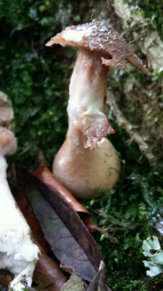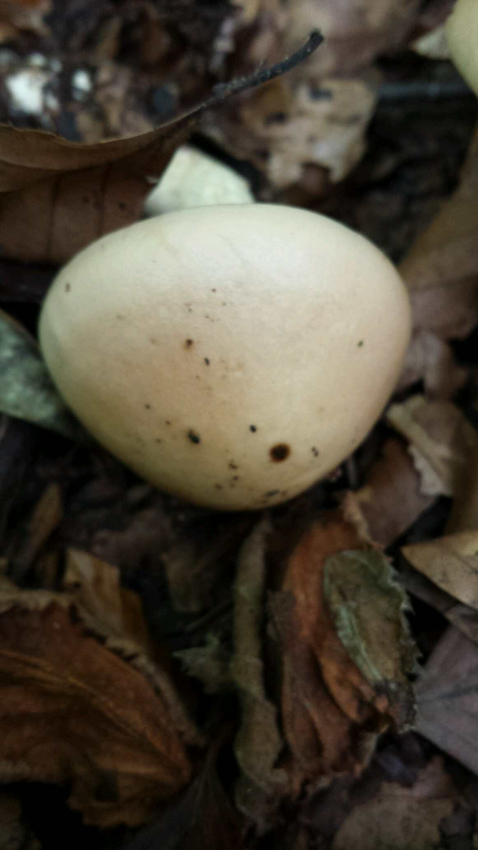 1. Im Stammfußbereich einer Buche, schwach angenehm riechender Pilz mit bauchigem Pilzfuß und Schüppchen auf dem Hut