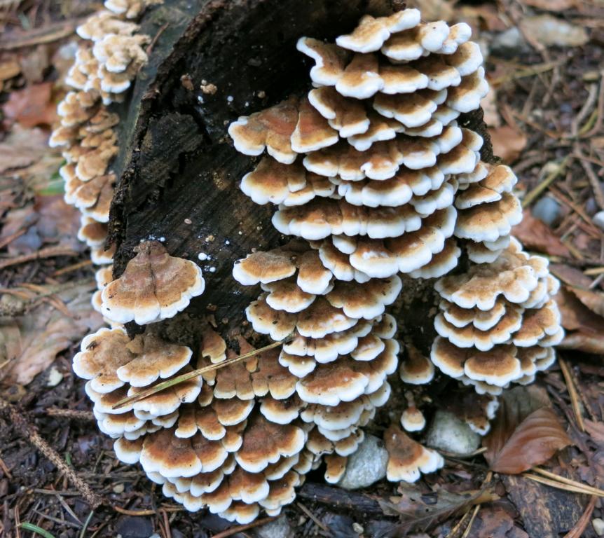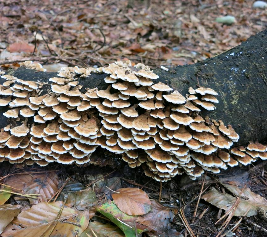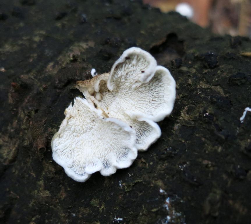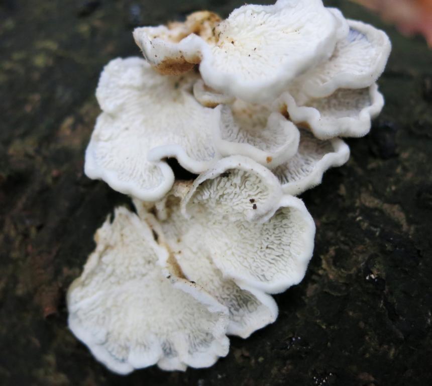 für heute hätte ich einen am Hartholzstamm (Buche) gefundenen, kleinen, in Schichten übereinander, lederartig biegsamen, dünnfleischigen, bunten, an Spaltblättling erinnernd, mit krausen verschlungenen "Lamellen", wenn`s welche sind, geruchlosen Pilz zu bestimmen.