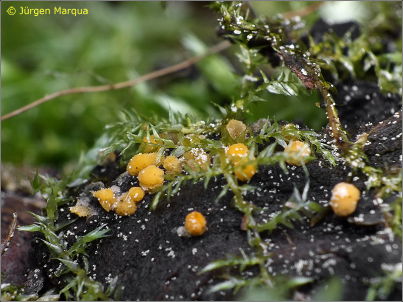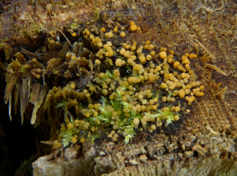 die große Schleimspur im Hintergrund deutet an, dass es sich hier um einen Myxo handeln könnte. Leider sieht man keine Details! Es gibt eventuell noch eine Anamorphe zu bedenken: Bactridium flavum - die bildet so kleine gelbe Kügelchen aus. Aber ohne vergrößerte Abbildungen bleibt alles Spekulation.