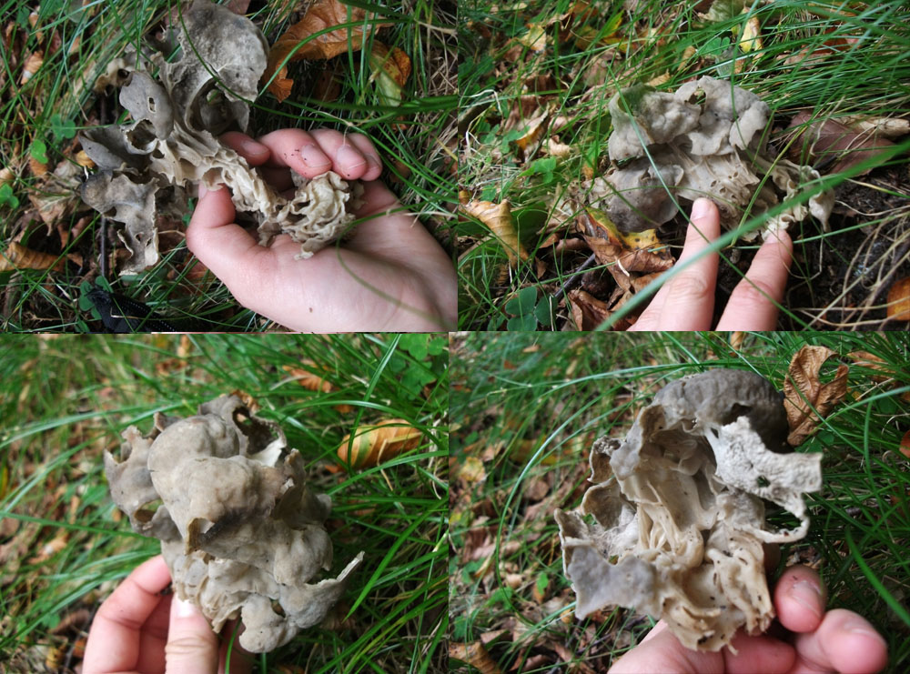 2.) Dieser Pilz hatte die Konsistenz einer Krausen Glucke, war auch so groß wie meine Hand, hatte allerdings einen Stiel (soweit ich es erkennen konnte). Roch nussig.