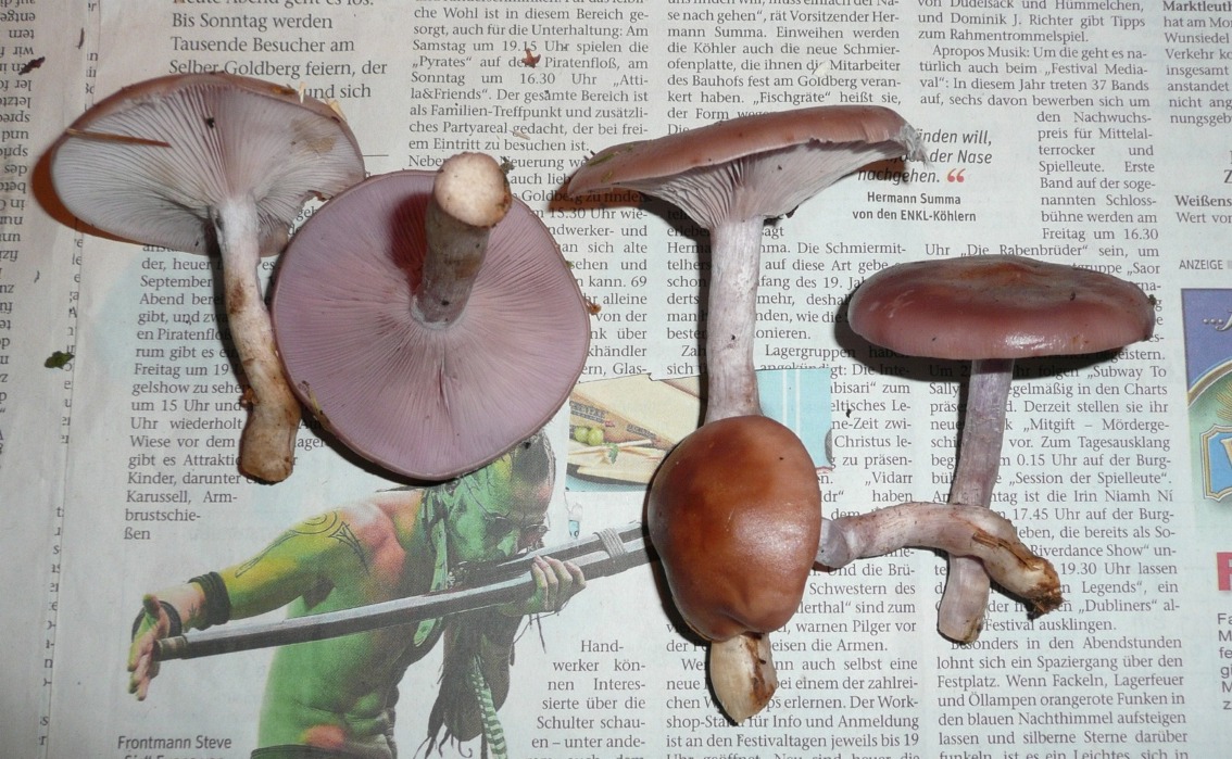 Wenn deine Pilze also Weißsporer sind, dann sollte es schon Lepista nuda sein.Lepista nuda sport nicht weiß, sondern rötlich. Vermutlich meint Pablo damit die Abgrenzung zum rostbraunen Sporenpulver der Cortinarien.