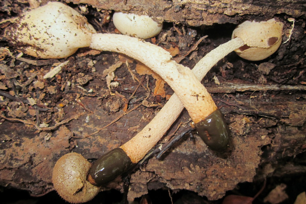 Bild 3:Die Gemeine Hundsrute (Mutinus caninus) wächst schon seit Anfang August in größerer Zahl auf einem stark zersetzten Stubben.
