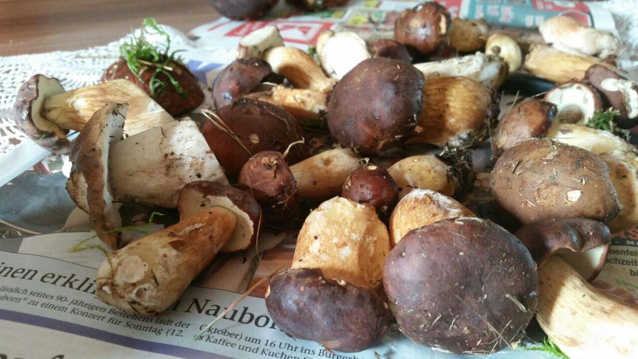 Durchaus möglich, daß auch 4 Kiefernsteinpilze auf dem Bild sind. Dazu ein Herrenpilz und etliche Maronen.