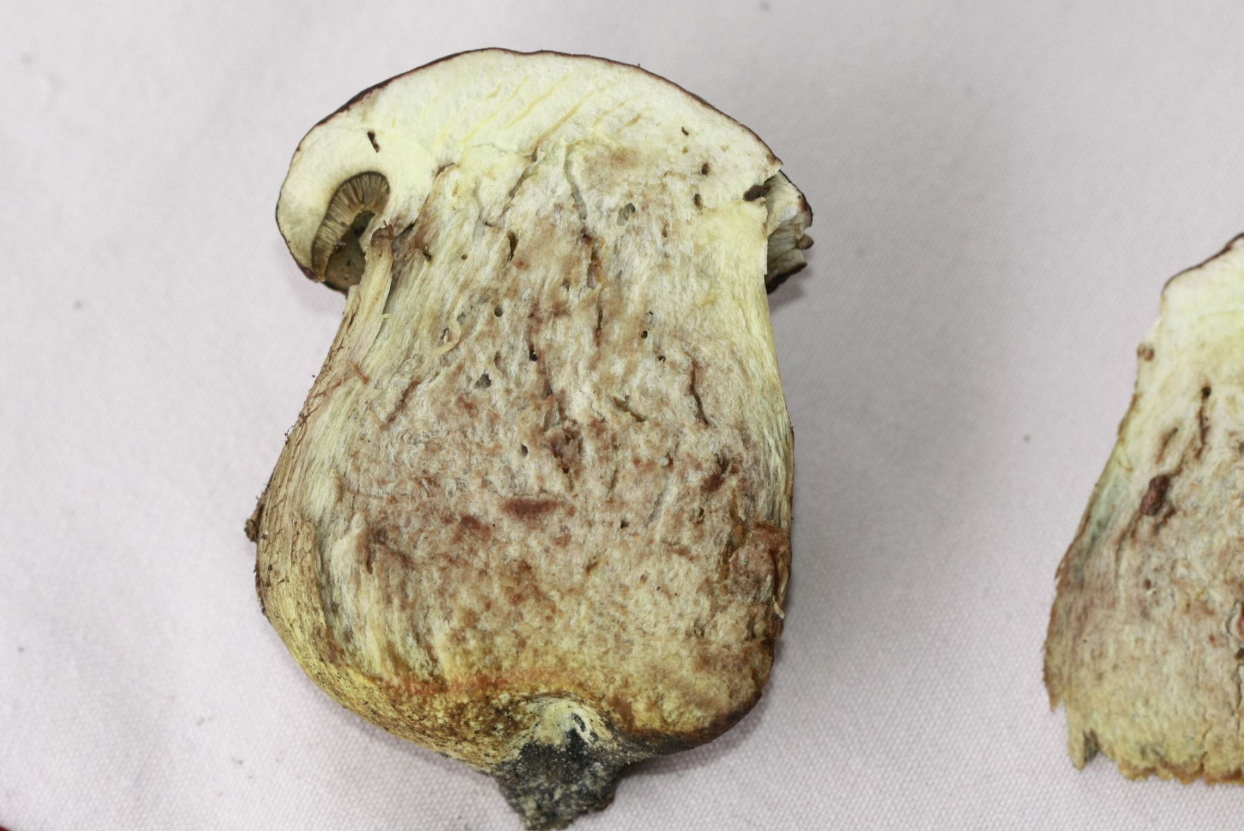 Bei Querschnitt des Pilz sieht dieser leider nicht mehr frisch aus, wer weiß, wie lange er schon gelegen hat. Vielleicht ist es auch möglich, dass bei "abgelagerten" Stücken die Farben des Fleisches bzw. Verfärbung anders aussehen als bei frischen Pilzen.