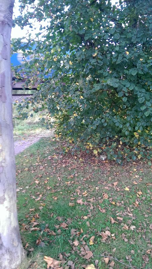Industriegebiet, kleines Wiesenstück mit Bäumen und Sträuchern, Nähe Bahndamm. Baum vermutlich Linde.