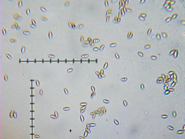 Die Sporen sind eher schmal, kaum bis ~6 µm breit und dabei maximal bis knapp über 10 µm lang. Möglicherweise auch fein warzig, das ist mit meiner Optik nicht sicher festzustellen.