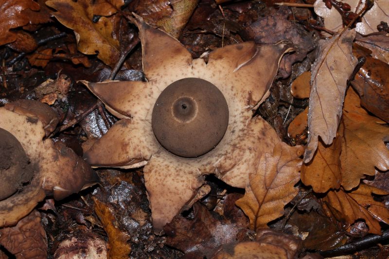 Anschließend ging es in das nahe gelegene Sperlingsholz zu einer kleinen Vorexkursion. Dabei konnten wir bereits viele tolle Pilze entdecken, wie den Weißen Stoppelpilz (Hydnum albidum), den Getropften Schleimschirmling (Limacella guttata) oder riesige Scharen von Halskrausen-Erdsternen (Geastrum triplex) und den Gewimperten Erdstern (Geastrum fimbriatum), den ich euch auf dem folgendem Bild zeigen möchte.