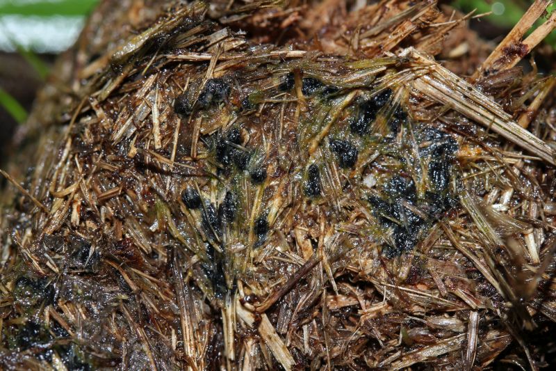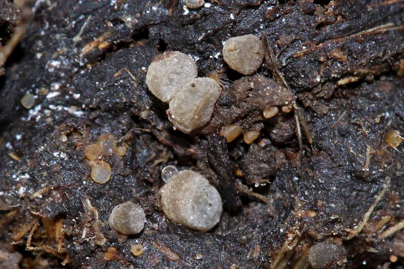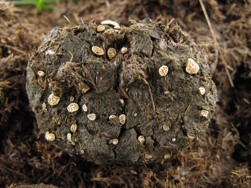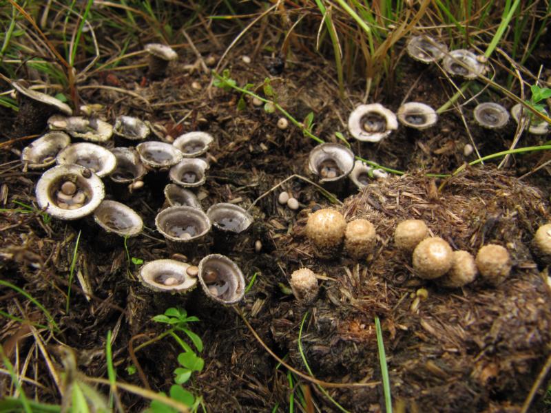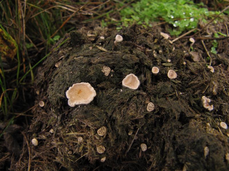 Auf dem Pferdedung sowie den aufgesammelten Schaf- und Hasenkötteln wurden natürlich auch reichlich obligate Dungpilze entdeckt, die in der Regel erst zu Hause bearbeitet wurden und immer noch werden. Den mitgebrachten Dung habe ich auf 13 kleine Feuchtkammern, sozusagen Minibiotope in Dosen, verteilt. Bis jetzt konnte ich daran 36 Arten bestimmen, einige werden sich in den nächsten Tagen vermutlich noch entwickeln.