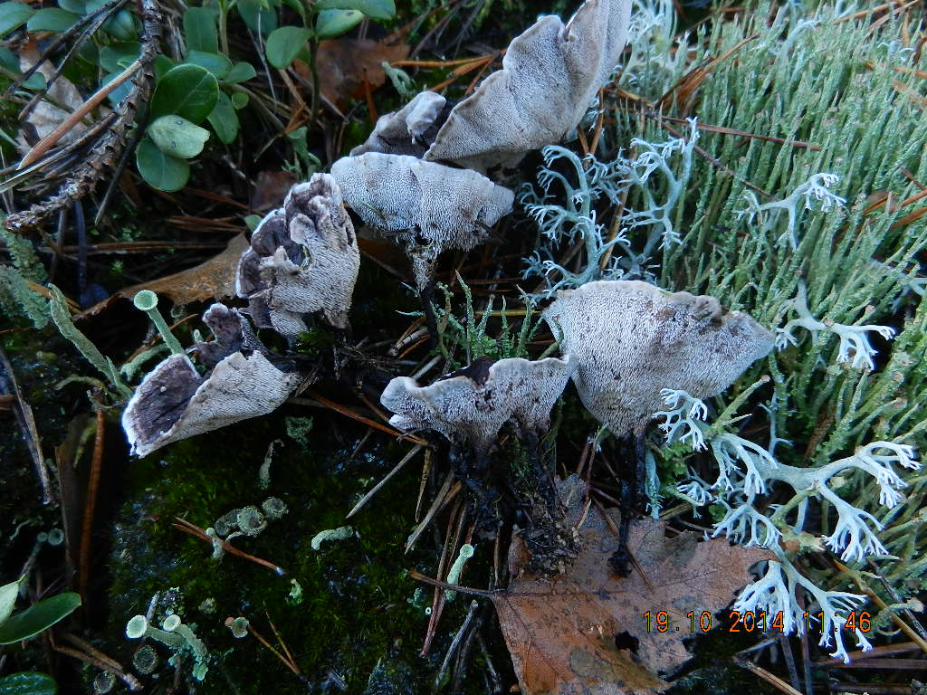 2) Phellodon melaleucus (= connatus); ebenda gefunden; dieser Pilz wurde neulich in einem anderen Thread diskutiert, damals hatte ich eingeworfen, dass es ein relativ kleiner Pilz sei und nur sehr dünne Stiele habe - voila!