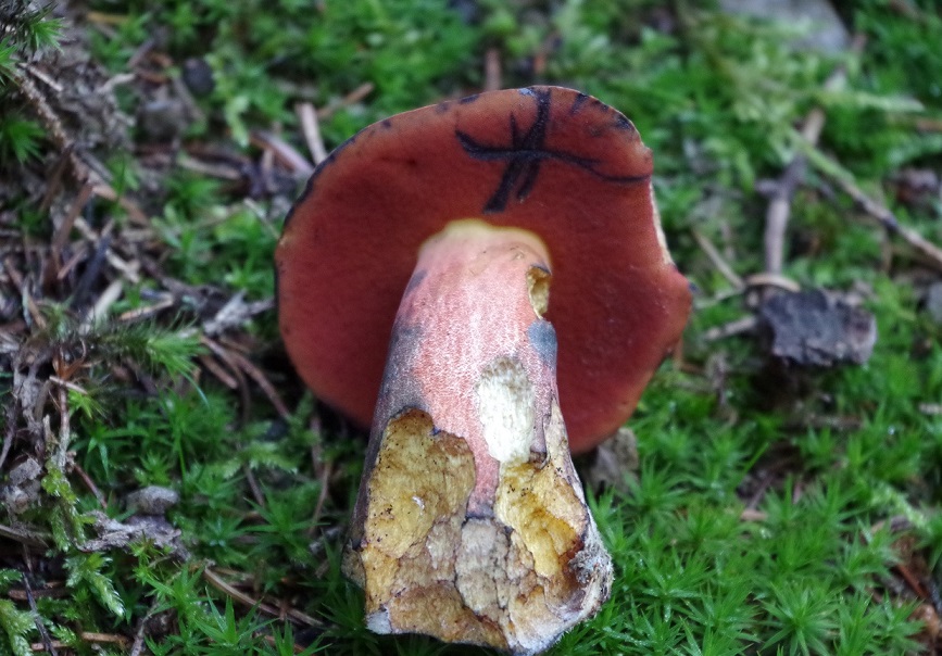 Ich drehe den Pilz hin und her, nein, keine Netzzeichnung. Jawohl, ein Erstfund - meine ersten Flockenstieligen Hexenröhrlinge!