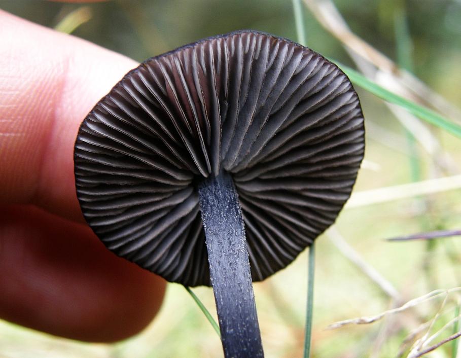 Eine Art mit blauschwarzen Lamellenschneiden und nur sehr jung blauen Tönen am Hutrand ist der