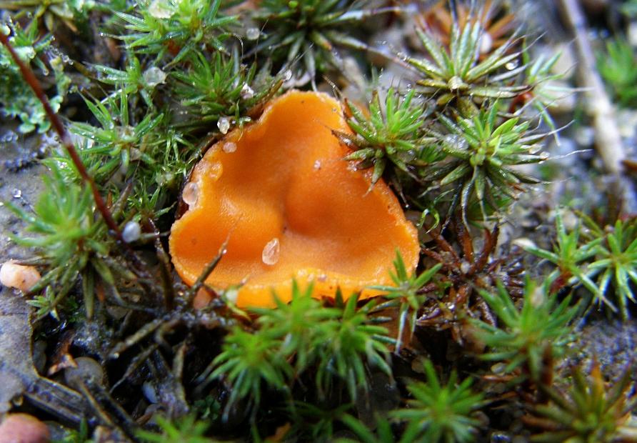 Der folgende Moosbecherling wurde bereits gezeigt und benannt, hier noch ein Foto, wo man ahnen kann, wie klein er ist (dabei ist er eigentlich ein Riese unter den Moosbecherlingen!).