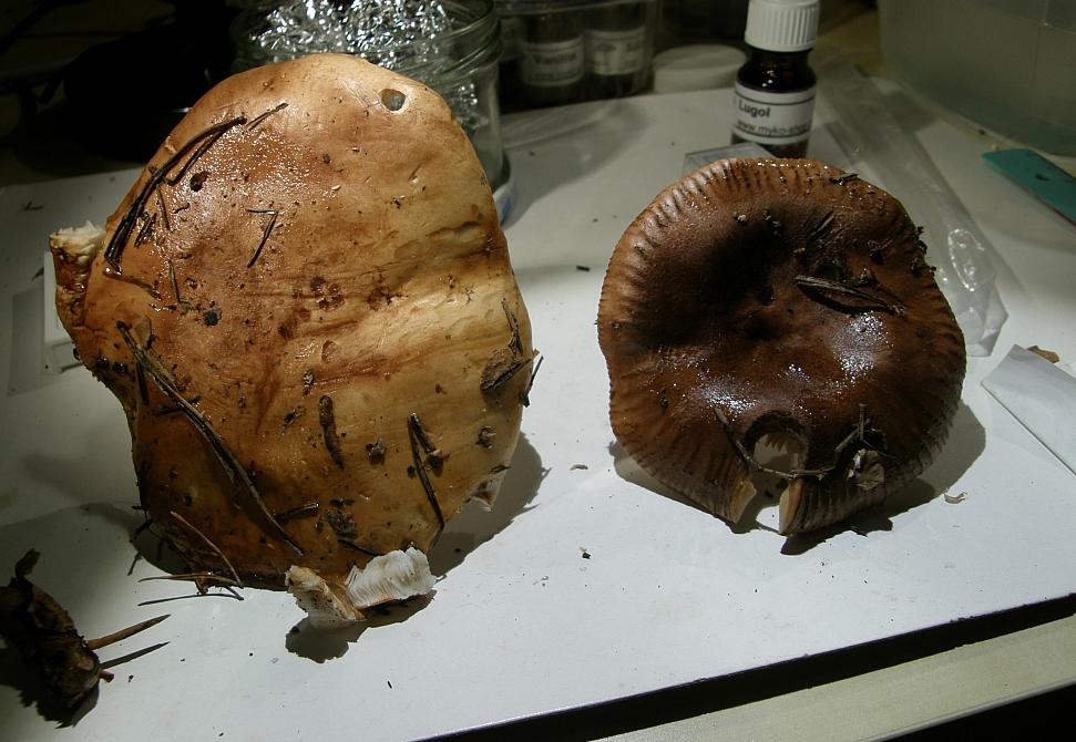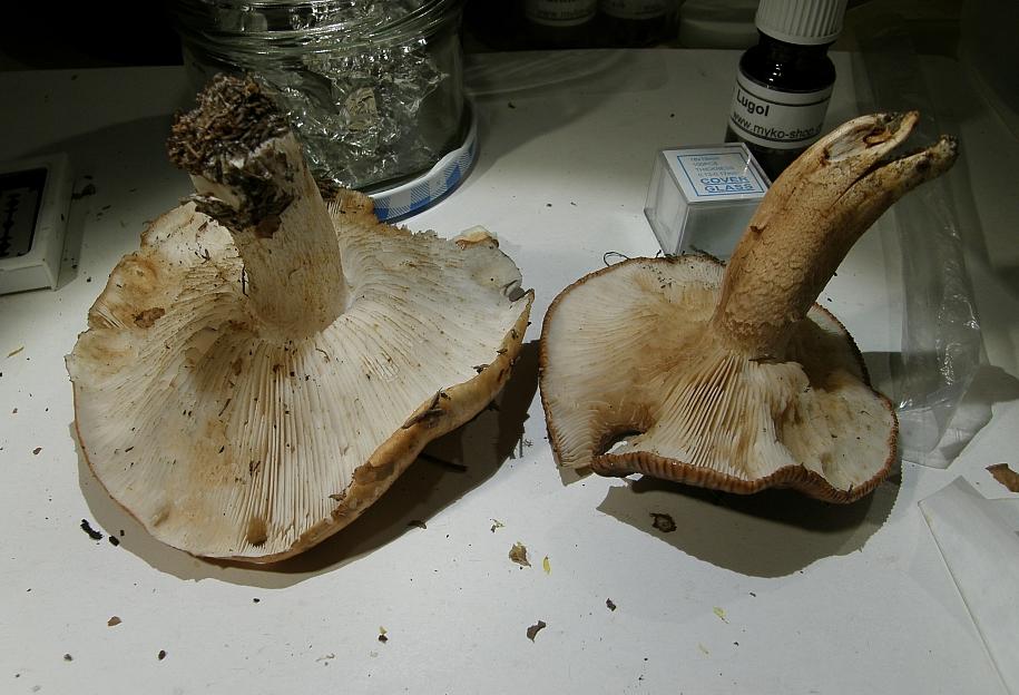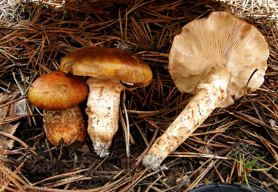 Eine recht große Art mit (leider) kaum radialstreifiger Hutoberfläche, Mehlgeruch und gelegentlich dunklen Punkten am Hut. Wie alle folgenden Arten ein Kiefernbegleiter. Weiße Lamellen, kaum schuppiger Stiel ohne Ring oder Pseudoringzone.