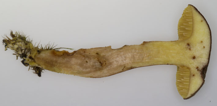 Soll X. ferrugineus nicht weißes Fleisch und ein Pseudo-Netz auf der Stielrinde haben? Dieses hier ist eindeutig gelb und das Pseudo-Netz fehlt, was dann für X. subtomentosus spricht.