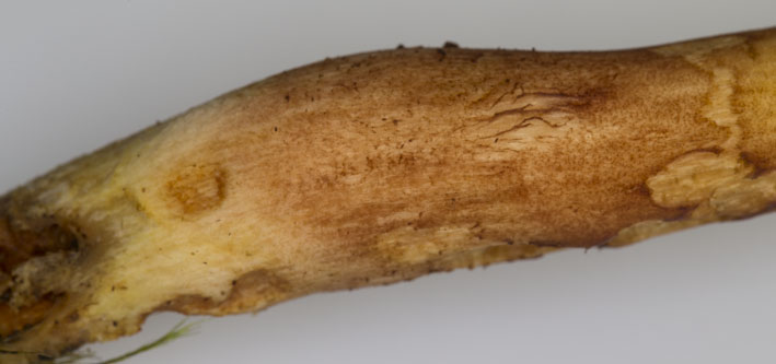 das Basalmycel ist schon ganz schön gelb. Allerdings besitzt X. ferruginosus normalerweise sehr üppige, leuchtend gelbe Rhizomorphen. Verfärbte sich das Fleisch im oberen Bereich leicht blau?