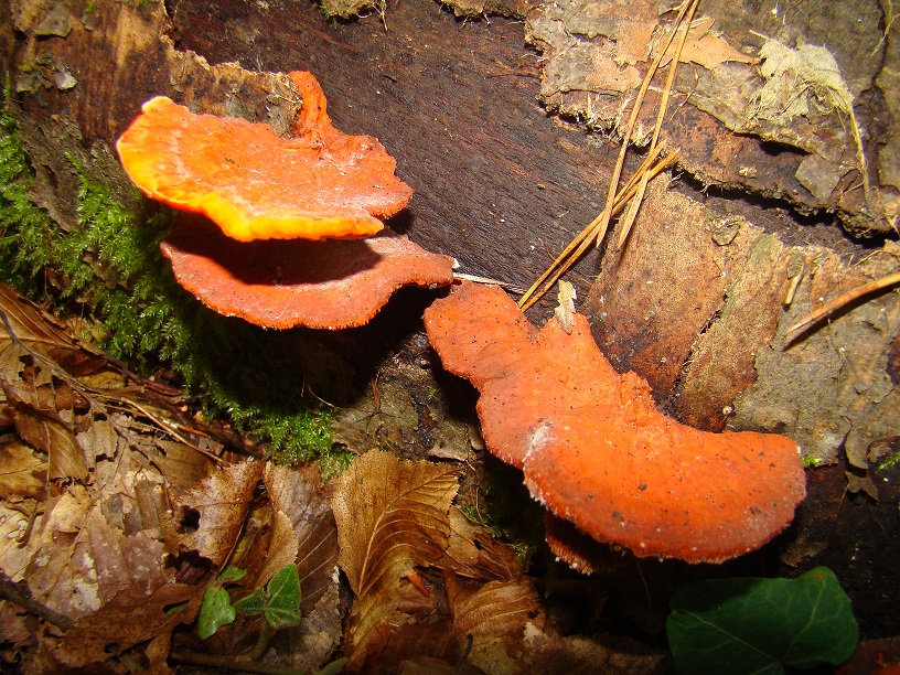 • Nachfolgende Bilder hatte ich neulich im Naturgucker eingestellt, als Zinnober-Tramete benannt. Die Exemplare waren von 2 liegenden Stämmen in kurzer Entfernung. Einige sahen durchaus typisch aus, andere (ca. 30 m entfernt an einem anderen Stamm) waren leuchtend gelborange