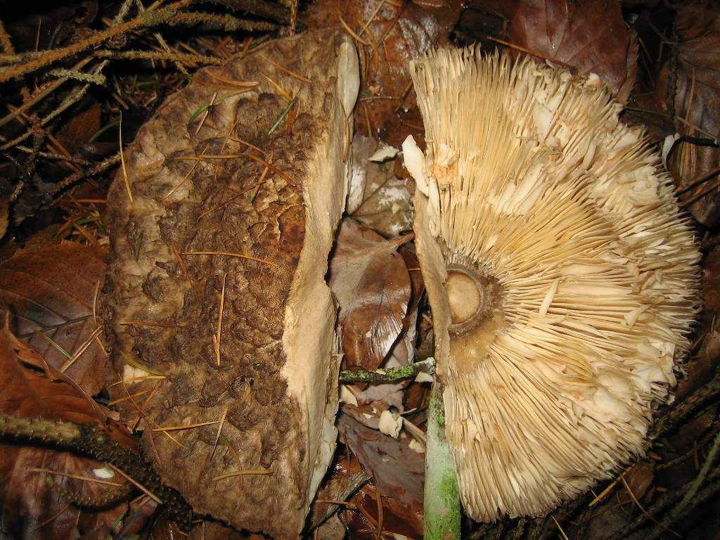 an einem richtigen "Hot-Spot" bin ich zuletzt leider immer vorbeigelaufen, weil die Pilze aus der Entfernung immer nach Nebelkappen aussahen. Jetzt habe ich sie mir trotzdem mal angeschaut und es hat mich fast vom Hocker gehauen: In Reih und Glied standen dort vier riesengrosse Parasole dicht an dicht nebeneinander ! Mit einem Grashalm nachgemessen hatte der Groesste 29 cm Durchmesser, die anderen um die 25 cm ! Leider haben sie vor ein paar Tagen Frost abbekommen, deshalb was die Oberflaeche schon braun, aber der Pilz selber eigentlich okay, wie man an den weissen Lamellen sehen kann. Insgesamt habe ich noch 8 Parasole gefunden, was mich daran beeindruckt hat waren nicht nur die Ausmasse des Hutes, sondern auch die Dicke der Knolle und des Stiels: Der war bei dem groessten Pilz naemlich noch ueber 2 cm dick, die Knolle sogar ueber 5 cm, nach meiner Erfahrung speichert der Parasol ja dort die Energie fuer den Hut, haette also ohne den Frost noch viel groesser werden koennen ! Vielleicht handelt es sich ja eine neue Gattung, moeglicherweise "Macrolepiota procera Hiems" (Hiems fuer lateinisch Winter :-).