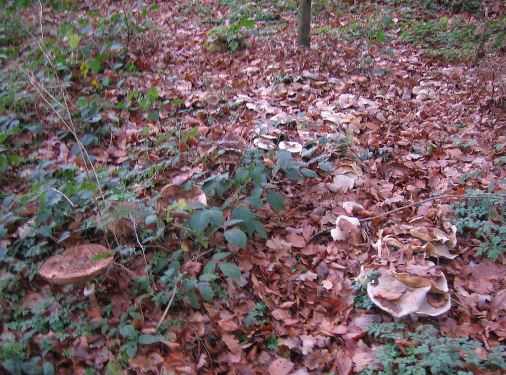 an einem richtigen "Hot-Spot" bin ich zuletzt leider immer vorbeigelaufen, weil die Pilze aus der Entfernung immer nach Nebelkappen aussahen. Jetzt habe ich sie mir trotzdem mal angeschaut und es hat mich fast vom Hocker gehauen: In Reih und Glied standen dort vier riesengrosse Parasole dicht an dicht nebeneinander ! Mit einem Grashalm nachgemessen hatte der Groesste 29 cm Durchmesser, die anderen um die 25 cm ! Leider haben sie vor ein paar Tagen Frost abbekommen, deshalb was die Oberflaeche schon braun, aber der Pilz selber eigentlich okay, wie man an den weissen Lamellen sehen kann. Insgesamt habe ich noch 8 Parasole gefunden, was mich daran beeindruckt hat waren nicht nur die Ausmasse des Hutes, sondern auch die Dicke der Knolle und des Stiels: Der war bei dem groessten Pilz naemlich noch ueber 2 cm dick, die Knolle sogar ueber 5 cm, nach meiner Erfahrung speichert der Parasol ja dort die Energie fuer den Hut, haette also ohne den Frost noch viel groesser werden koennen ! Vielleicht handelt es sich ja eine neue Gattung, moeglicherweise "Macrolepiota procera Hiems" (Hiems fuer lateinisch Winter :-).