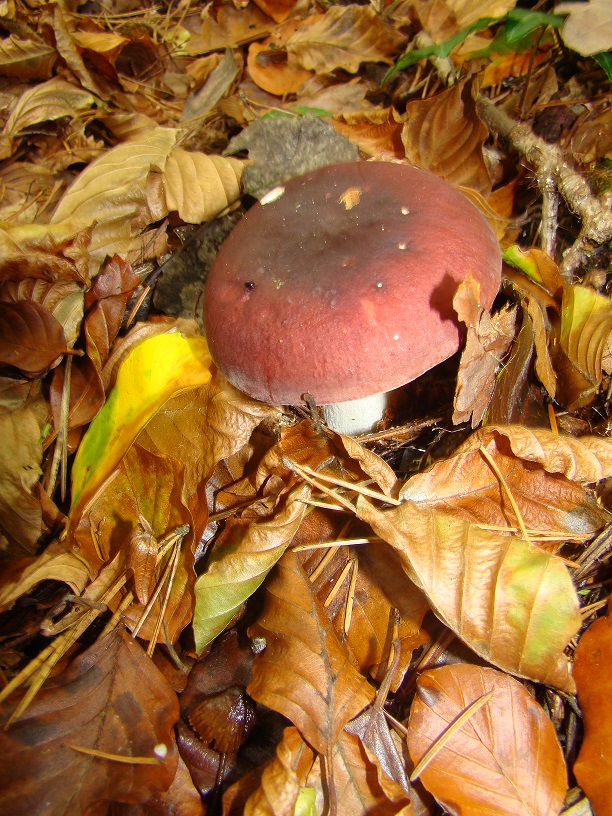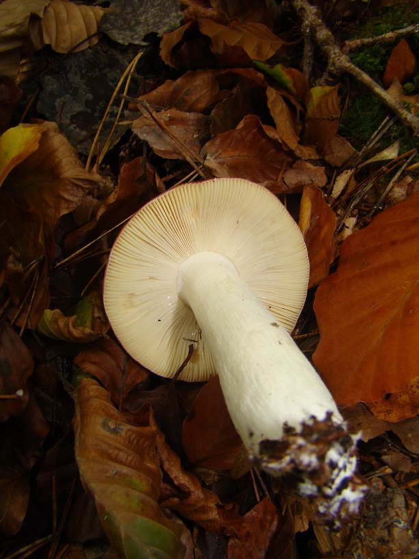 • Der auf deinen Bildern gezeigte Täubling sieht nicht ganz typisch für R. atropurpurea aus. Korrekt wäre die Hutfarbe (schwarzpurpur), der leicht scharfe Geschmack und die nicht reinweißen, sondern leicht gelblichen Lamellen. Allerdings ist meiner Erfahrung nach die Hutoberfläche von R. atropurpurea glatt bis glänzend, hier sieht sie eher matt bzw. bereift aus. Eichenblätter sieht man auf deinem Foto auch nicht, R. atropurpurea bräuchte zwingend die Eiche als Baumpartner. Ein weiteres Indiz für R. atropurpurea wären kleine gelbliche Rostflecken in der unteren Stielhälfte.