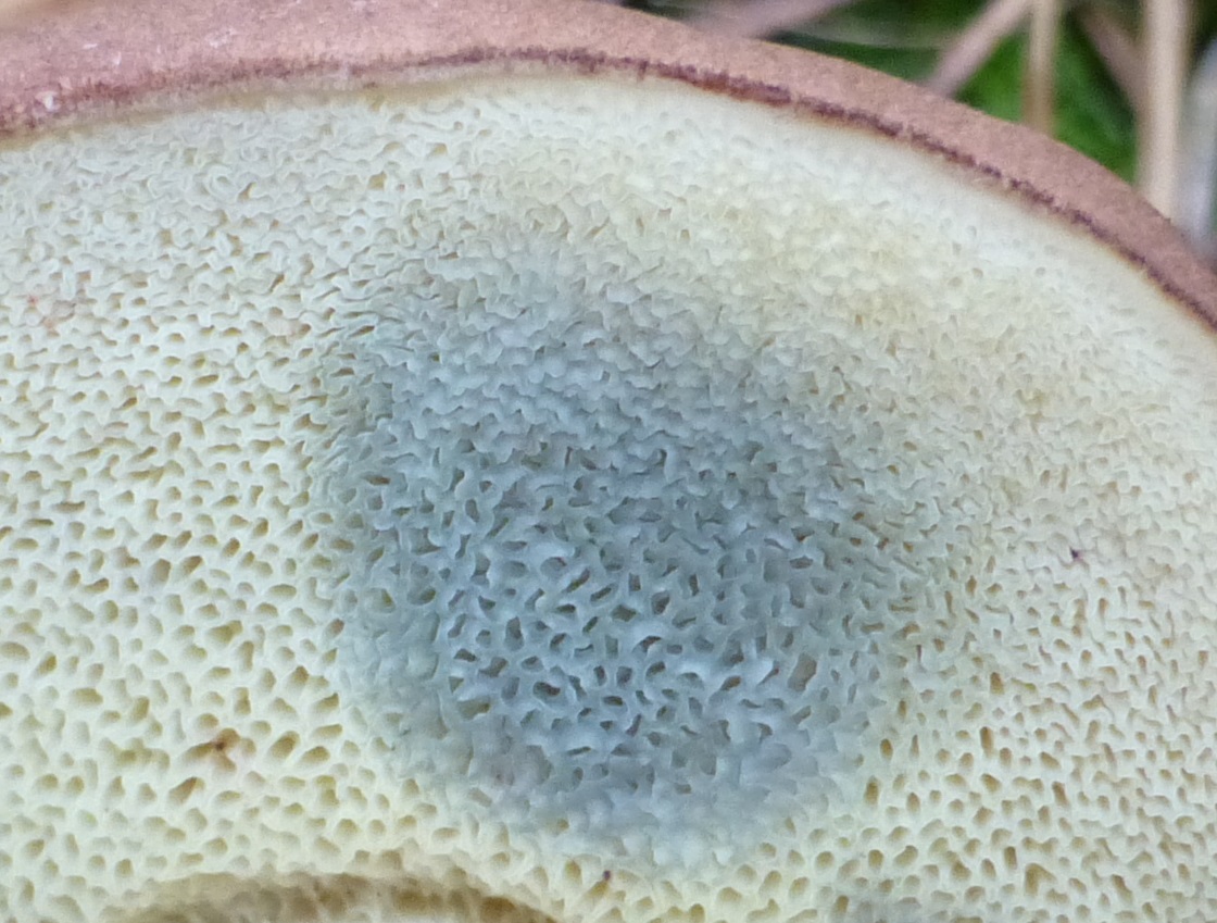 Der Querschnitt ergab keine weitere Verfärbung, nur an den Poren. Für das Foto vom Querschnitt habe ich die Poren der linken Fruchtkörperhälfte zuvor gedrückt, sie bläuten sofort gleichmäßig. Nach dem Schnitt waren auch fünf Minuten später keine Veränderungen zu erkennen.
