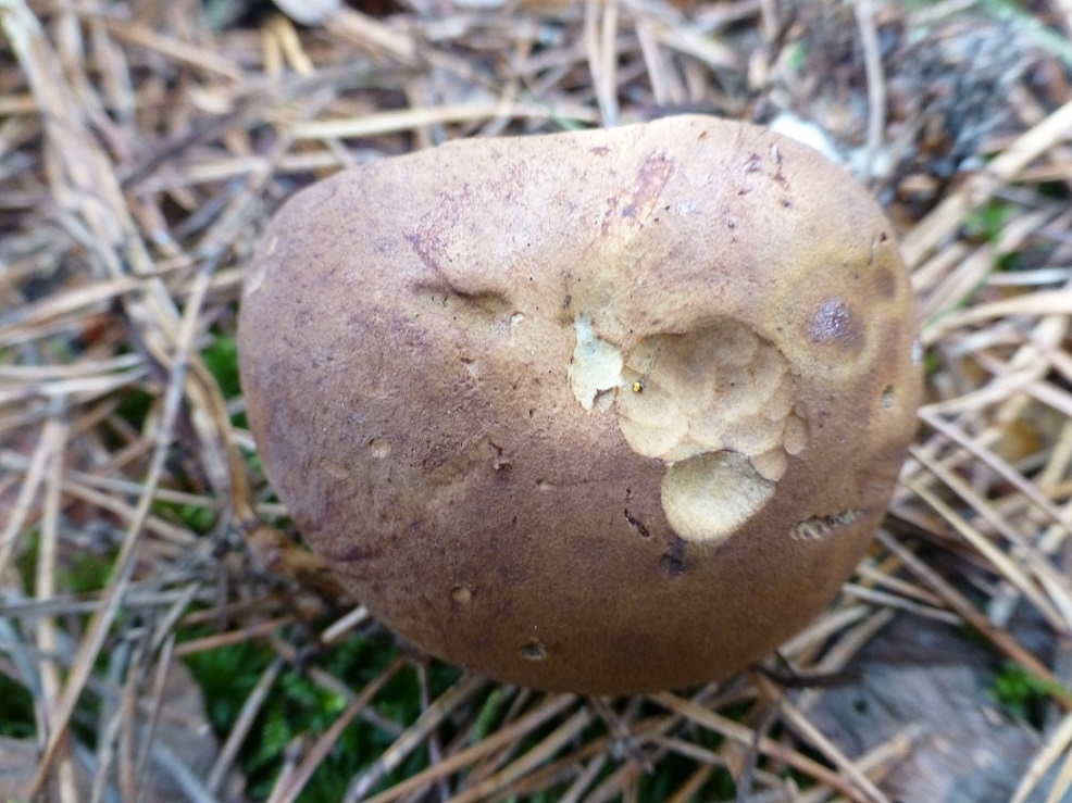 Fundort direkt am Fuße einer stattlichen Kiefer, matter, weicher Hut in hellbrauner Farbe. Kräftiger Stiel, eine feine Maserung am Stiel, die mir auffiel und die ich bis hierher noch nicht hatte.