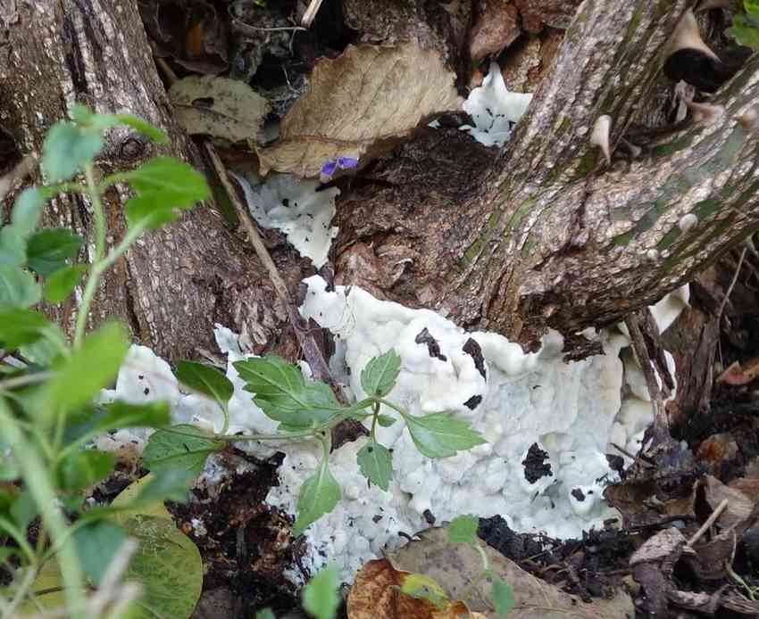 Hätte man beim Brandkrustenpilz nicht schon früher im Jahr etwas sehen müssen? Die weißen Krusten sind erst seit kurzem da, und letztes Jahr kamen sie auch erst im November.