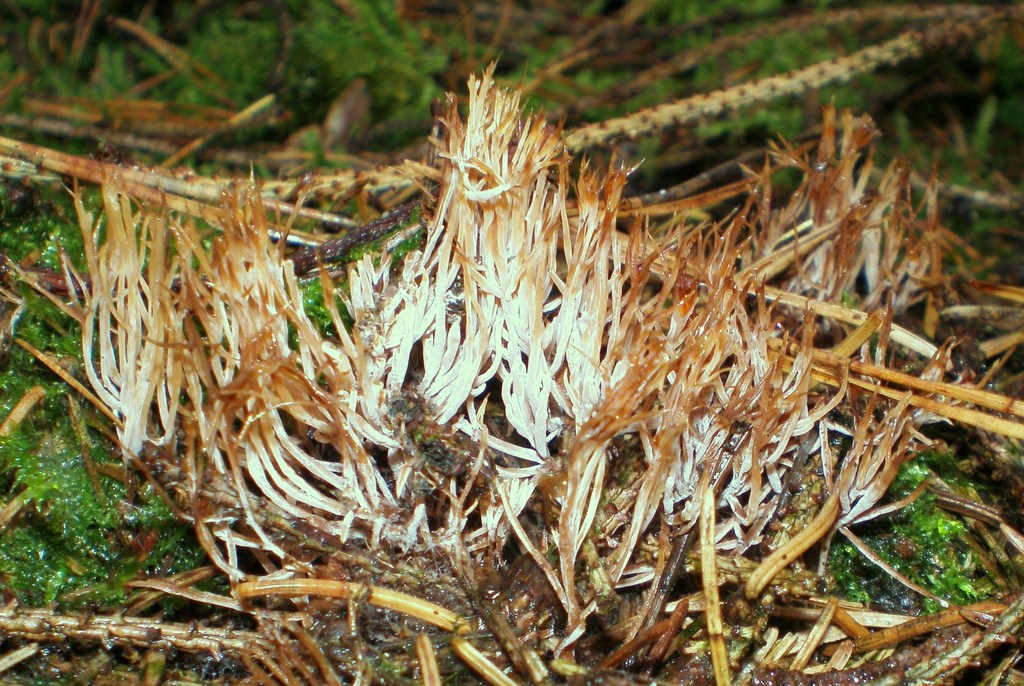 9. Die Weißliche Borstenkoralle (Pterula multifida) ist leicht am unangenehmen Geruch nach Desinfektionsmittel zu erkennen.