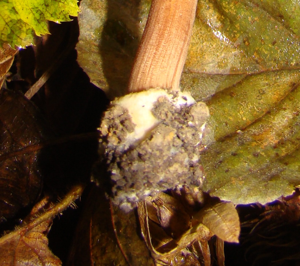 Und noch eine Ausschnitssvergrößerung der Volva, ist leider nicht 100% optimal in der Ansicht und nicht völlig scharf. Aber sie sieht scharf abgesetzt aus, ähnlich wie beim Pantherpilz: