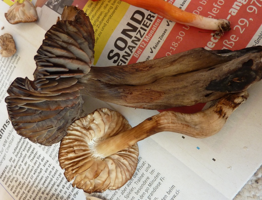 Der kleine Frk. darunter ist auf jeden Fall etwas Anderes. Wenn Du scheibst –žunangenehm stechend nach Chlor (Hallenbad)–œ so ist dieser Geruch dem nitrösen Geruch, der ebenfalls stechend sein kann, nicht unähnlich. Es handelt sich wohl um einen der beiden Nitrat-Saftlinge. Es gibt einen Rötenden Nitratsaftling H. ingrata und einen Nichtrötenden Nitrat-Saftling H. nitrata der von manchen Autoren auch als H. murinacea bezeichnet wird. Um welchen es sich handelt da möchte ich mich ohne Hutoberseite nicht festlegen, obwohl der Stiel schon eher für H. ingrata spricht.