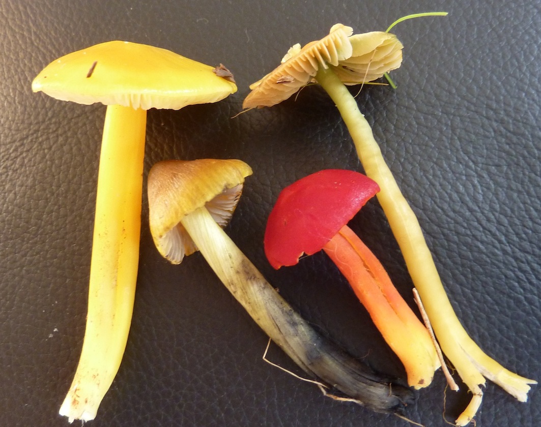 b) der zweite von li. in dem Vierergrüppchen wurde von der gestrigen Sammlergruppe Kegeliger bzw. Schwärzender Saftling benannt. Könnte es sich nicht auch um den Schwärzenden Orangesaftling handeln?