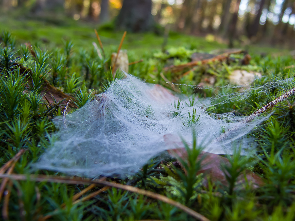 8.) Kein Pilz, aber wunderschön und ebenfalls in Massen zu finden: Spinnennetz am Boden