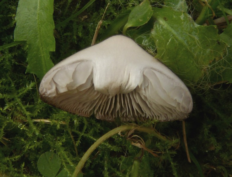 Lamellen weißlich, mäßig gedrängt, mit Zwischenlameletten, erst gerade, zum Stiel hin dann gerundet-bauchig, fast frei (oder ganz frei?).