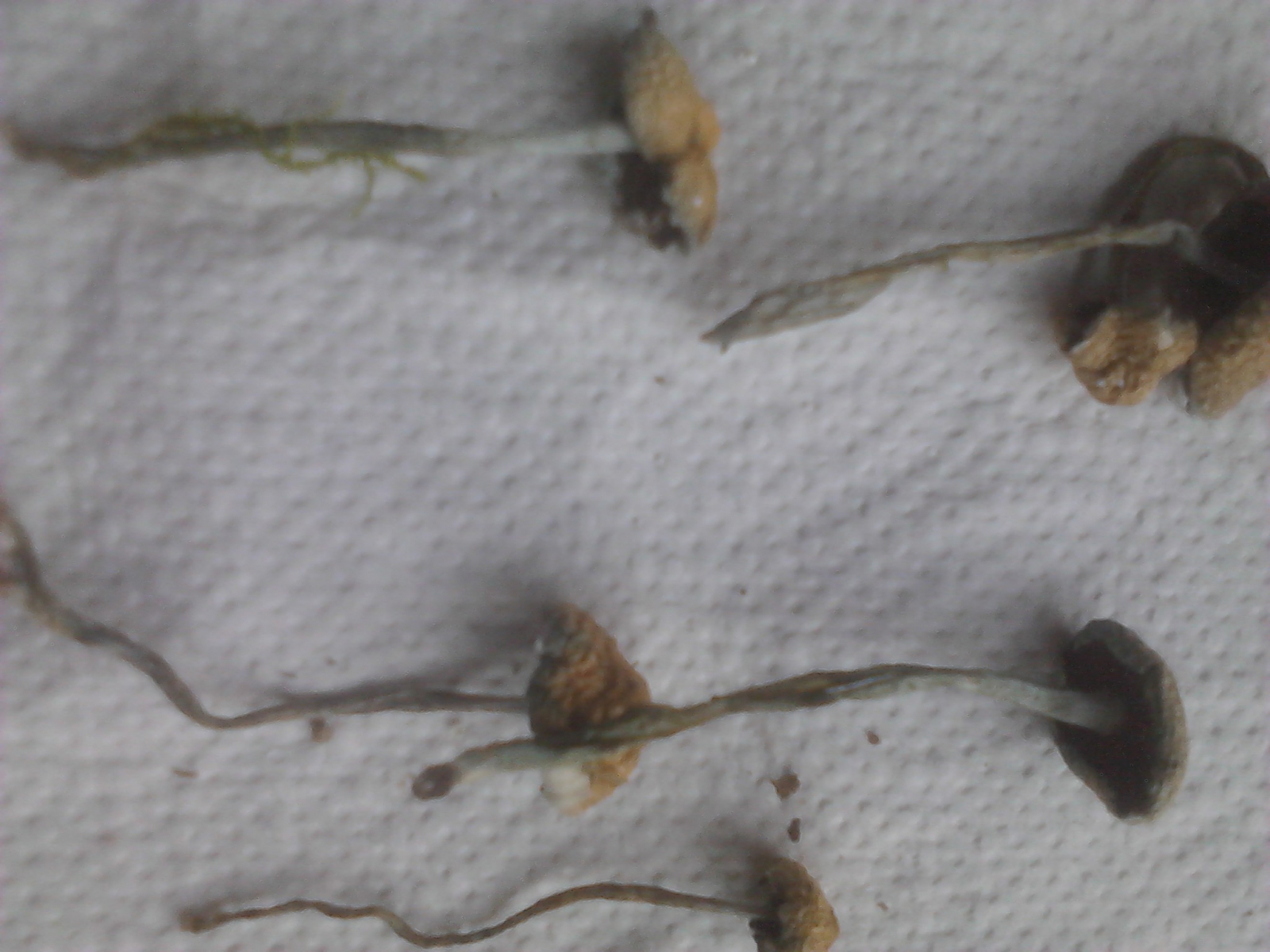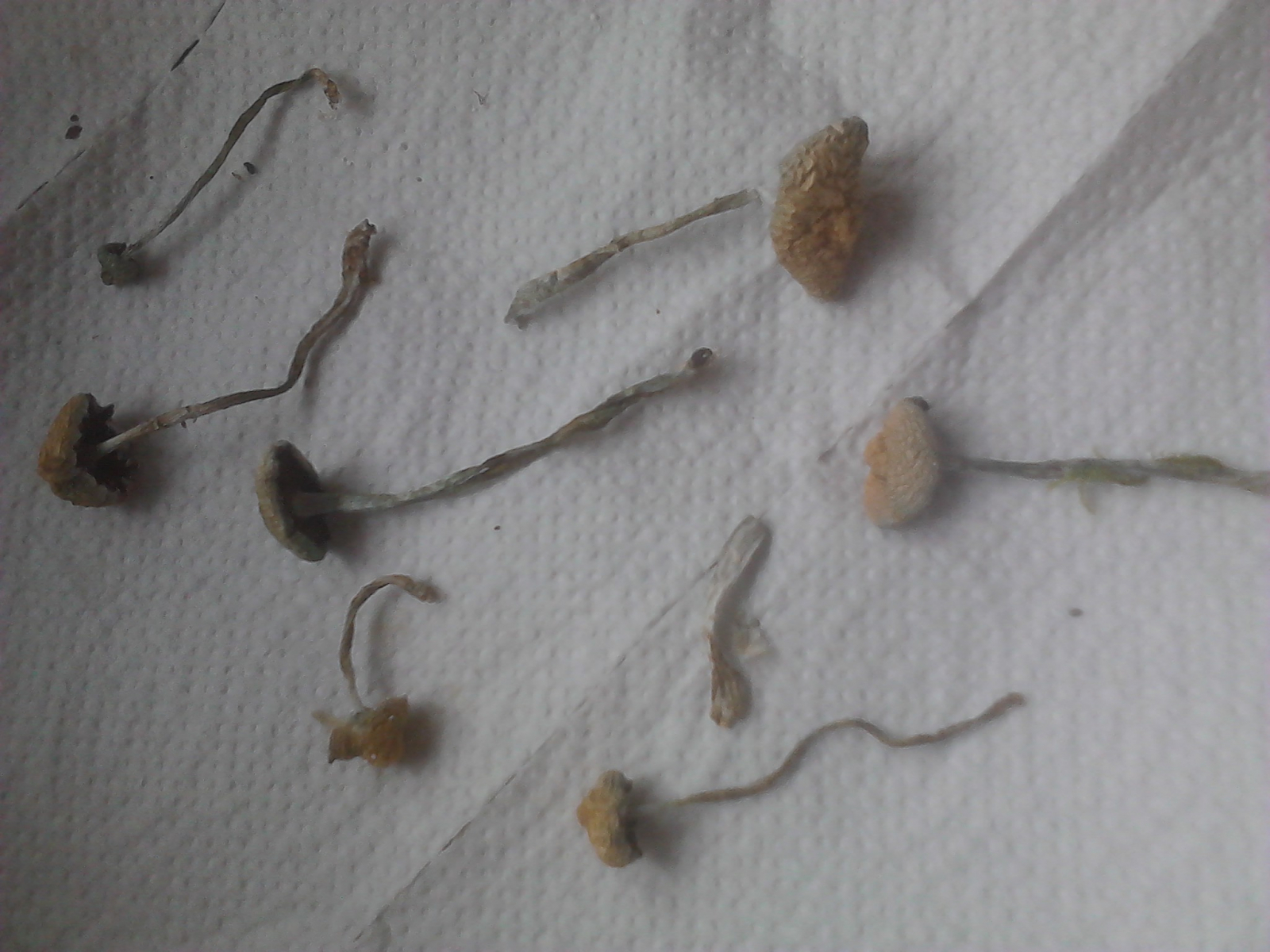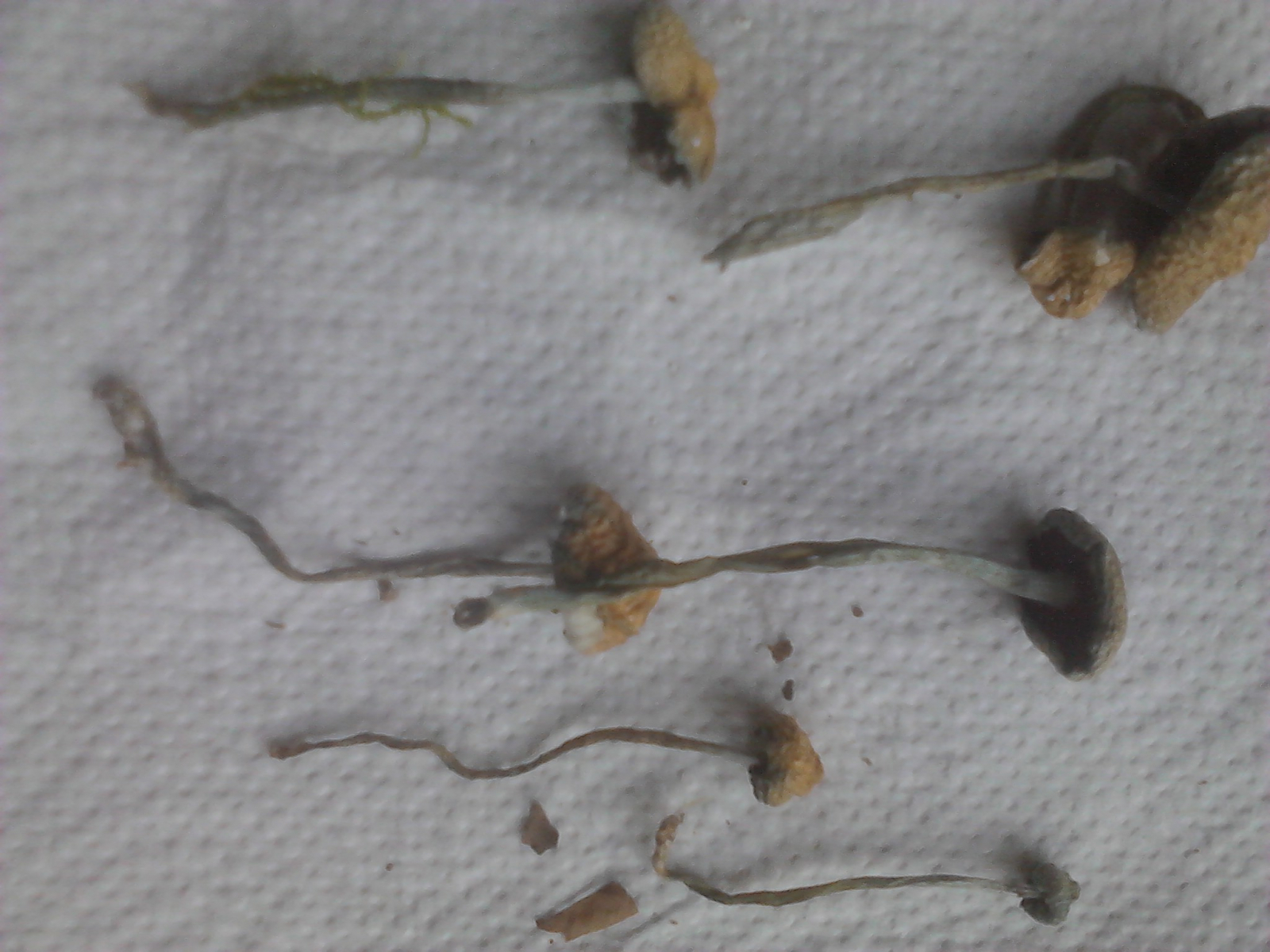 Der Stil ist faserig, der Hut verklebte recht schnell am Zellstofftuch, obwohl der Pilz nicht besonders schleimig/klebrig wirkte. Die beige- bis braunfarbenen Lamellen sind an den Stil angewachsen. Teile der angetrockneten Hüte erinnern ein wenig an Goldfolie. Der Hutrand hat einen gezackten Rand nach unten - eventuell Reste der ursprünglichen "Hülle".