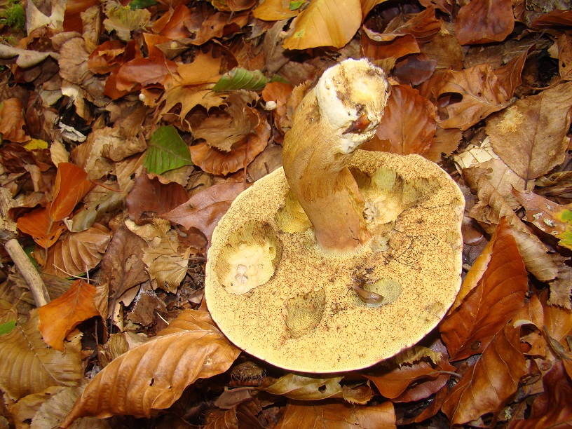 Ich bin insbesondere wegen der dicht stehenden Röhren eher auf Boletus gekommen. Die sind auf dem 2. Bild gut zu sehen. Am ehesten sehe ich hier Boletus appendiculatus. Insbesondere der Stiel ist zwar nicht typisch, aber neben den dicht stehenden hellgelben Röhren mit der leichten Ausbuchtung am Stiel weisen auch die zitronengelben Fraßstellen im Hut sowie die leicht überstehende Huthaut dahin.