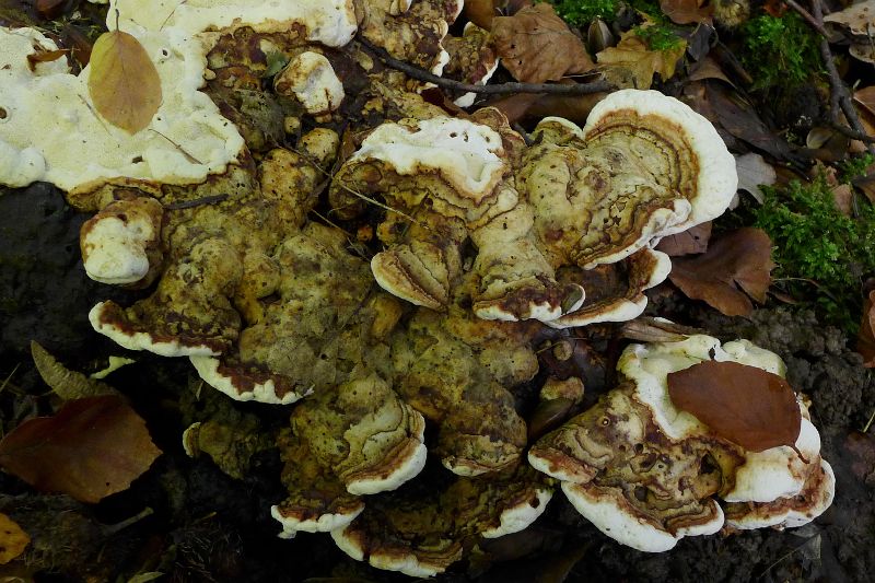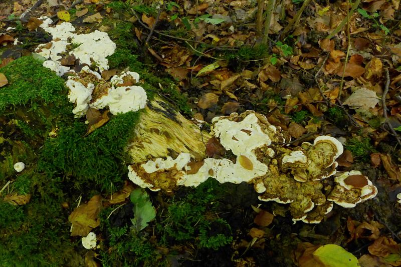 Heterobasidion annosum, Wurzelschwamm, alt, frisch, klein, an Nadelholzstümpfen