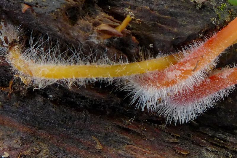 Mycena crocata, Gelbmilchender Helmling, nur "Füße"