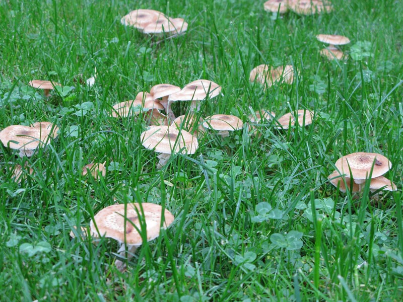 deine Pilze wachsen auf vergrabenem Holz (evtl. Reste von Baumwurzeln).
